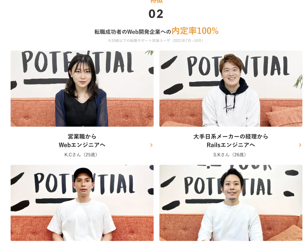 ポテパンキャンプを受講した先輩達の多くが、異業種からWeb開発系企業への転職に成功しており、講座を受講して良かったとの口コミが目立ちます。