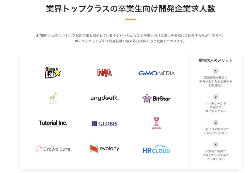 2,700社以上の企業と採用提携を結んでいるポテパンキャンプは、20代のカリキュラム修了生の就職率が100%と非常に高いことでも注目を集めています。