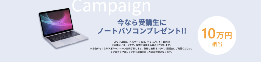 プログラマカレッジでは、ノートパソコンプレゼント(10万円相当)のキャンペーンを実施しています。プレゼントの対象は、プログラマカレッジから紹介を受けて就職が内定した方です。