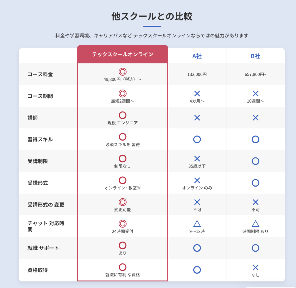一方、Techスクールキャンプは現役エンジニアにるフィードバックなどのサポートが完備。さらに、受講後の一定期間まで転職支援制度を利用でき、非常に費用効果が高いスクールと言えます。