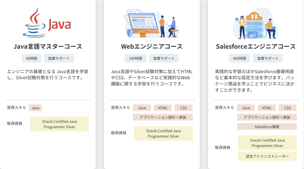 | 学習時間 | プランにより異なる Java言語マスターコース : 80時間 Webエンジニアコース : 240時間 Salesforceエンジニアコース : 400時間 |